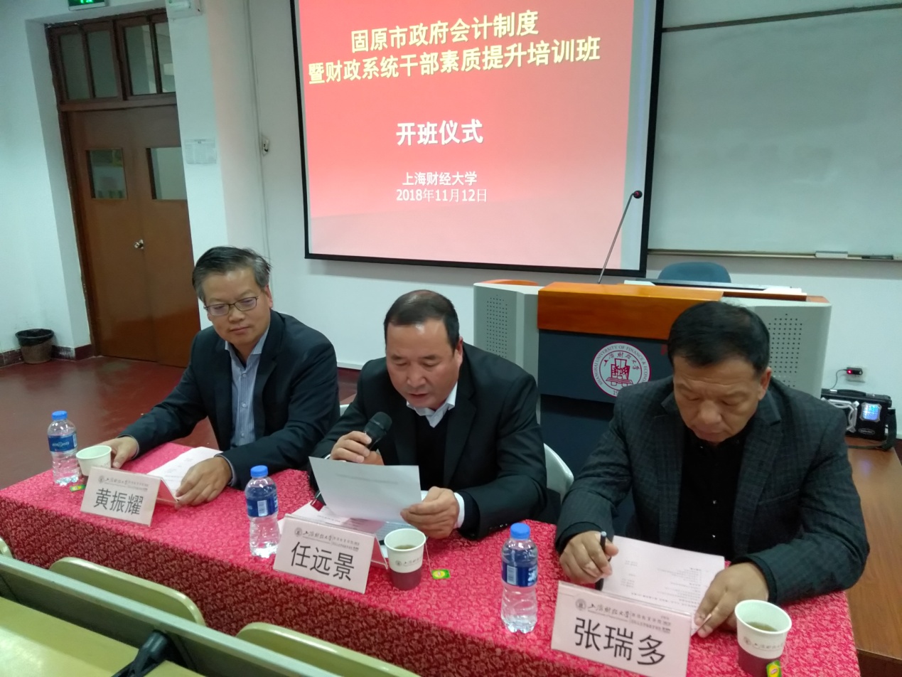 2018年11月12日,宁夏固原市政府会计制度暨财政系统干部素质提升培训班在我校继续教育学院顺利开班。出席本次开班仪式的领导有宁夏回族自治区固原市财政局副局长任远景先生、原州区财政局会计核算中心主任张瑞多先生、上海财经大学继续教育学院培训部主任黄振耀教授。